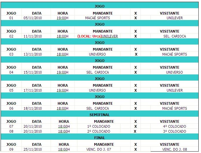 5/11, às 19 horas - Macaé x Unilever, ginásio Municipal Eng.° Maurício Soares Bitencourt, em Macaé
